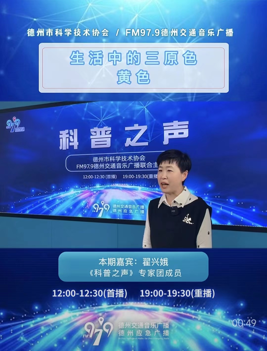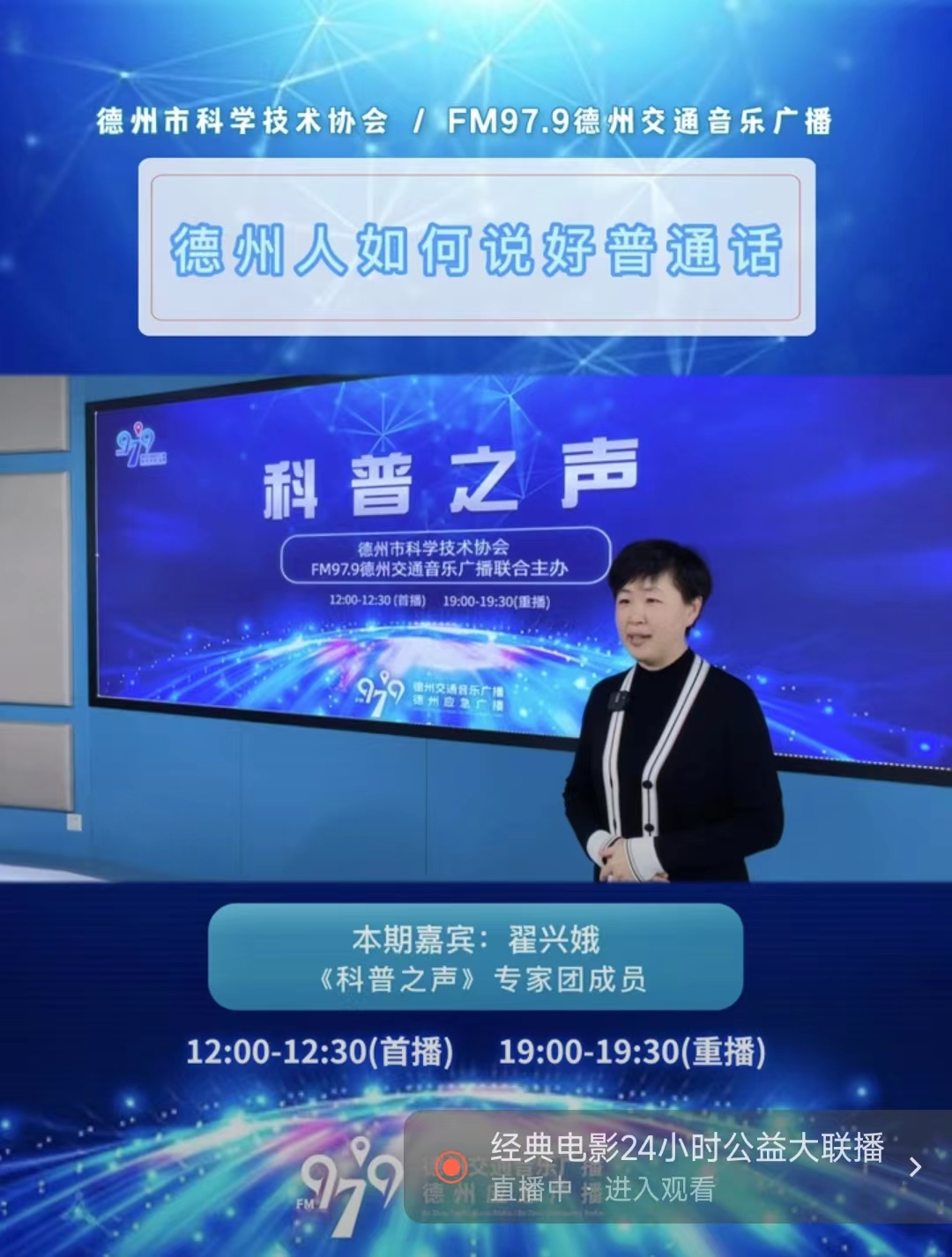 《科普之声》栏目由德州市广播电视台与德州市科学技术协会共同策划,FM97.9交通音乐广播频率制作播出。从今年4月底开始,翟兴娥教授已参加了七期《科普之声》栏目的直播录制。在《德州人如何说好普通话》系列中,翟兴娥教授讲解了如何通过纠正声母、韵母的发声部位,以及明晰声调来讲好普通话的方法。同时在《生活中的三原色》系列节目中讲述了红色、黄色、蓝色三种颜色给人的视觉感受以及背后的文化基因。直播节目播出之后,受到德州交通音乐广播电台领导的一致好评和听众的热烈欢迎。