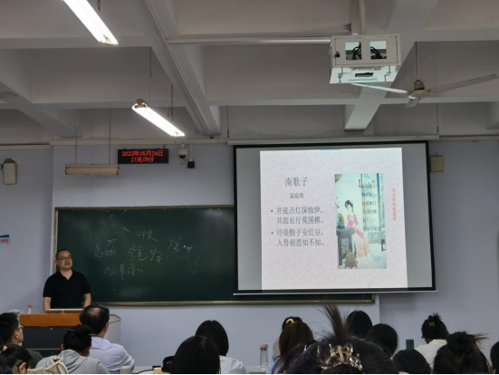张教授从传统诗词吟诵入手,指出古典诗词研究既要具体的文学作品出发,通过考察作者身处的时代背景与社会经历,来感触文学作品多层次的文化内涵,又要“识文嚼字”,抓住诗词中的细节构成。张教授从“大视野”和“小窍门”两个角度分析了鉴赏古典诗词的关键,整场报告积极调动学生的自主性,引人入胜。