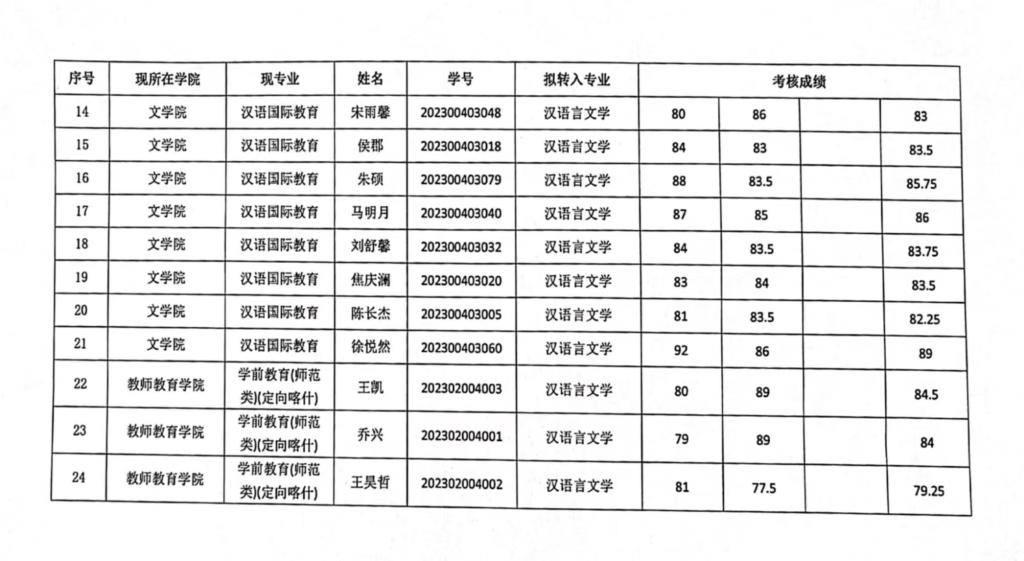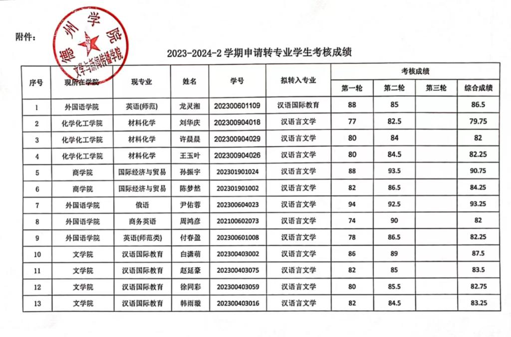 2023-2024-2学期申请转专业学生考核成绩,经德赢ac米兰官方合作转专业工作领导小组审核后予以公示,公示时间自2024年7月11日至7月13日,请参加转专业考核的同学及时查看附件。公示期间如有异议,请向文学院转专业工作领导小组提交书面申请(签署真实姓名和本人联系电话),并提供相关材料。