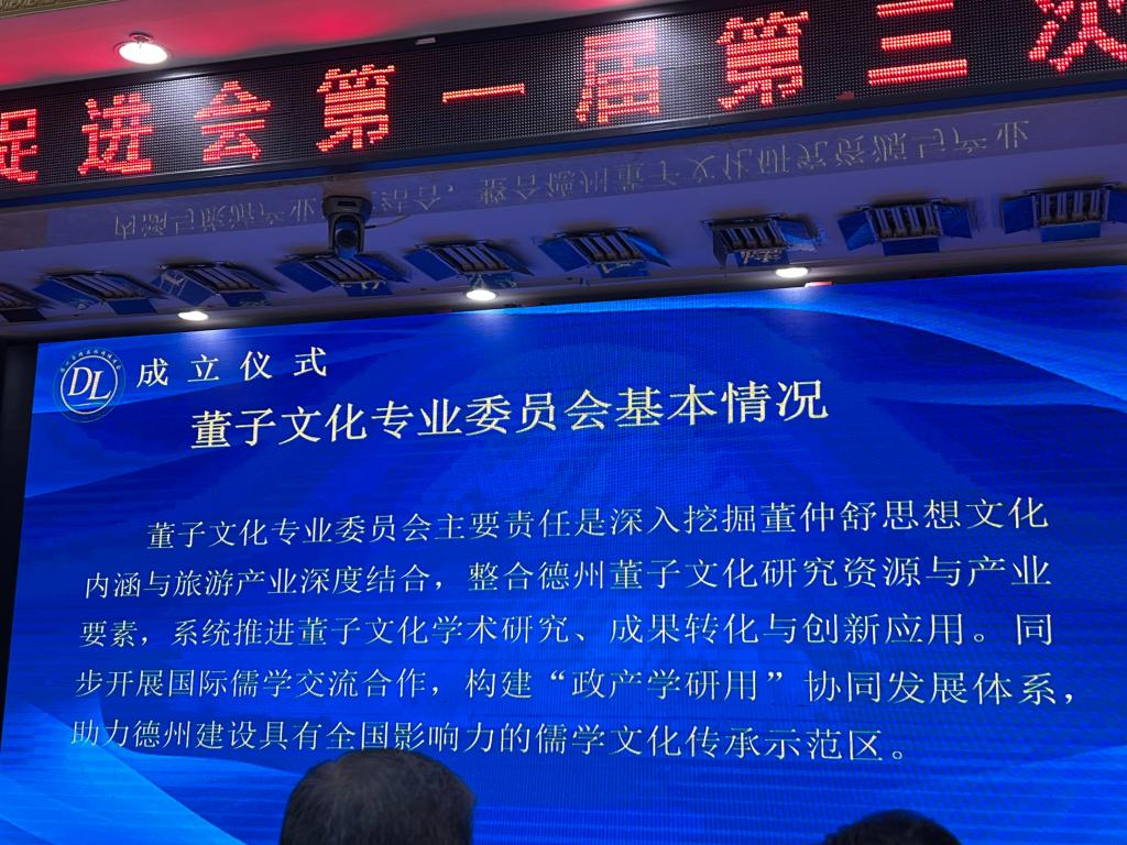 2025年4月27日,德州市精品旅游促进会一届三次会员大会上,董子文化专业委员会正式揭牌成立。董子文化专业委员会主要责任是深入挖掘董仲舒思想文化内涵与旅游产业深度结合,整合德州董子文化研究资源与产业要素,系统推进董子文化学术研究、成果转化与创新应用。同步开展国际儒学交流合作,构建“政产学研用”协同发展体系,助力德州建设具有全国影响力的儒学文化传承示范区。