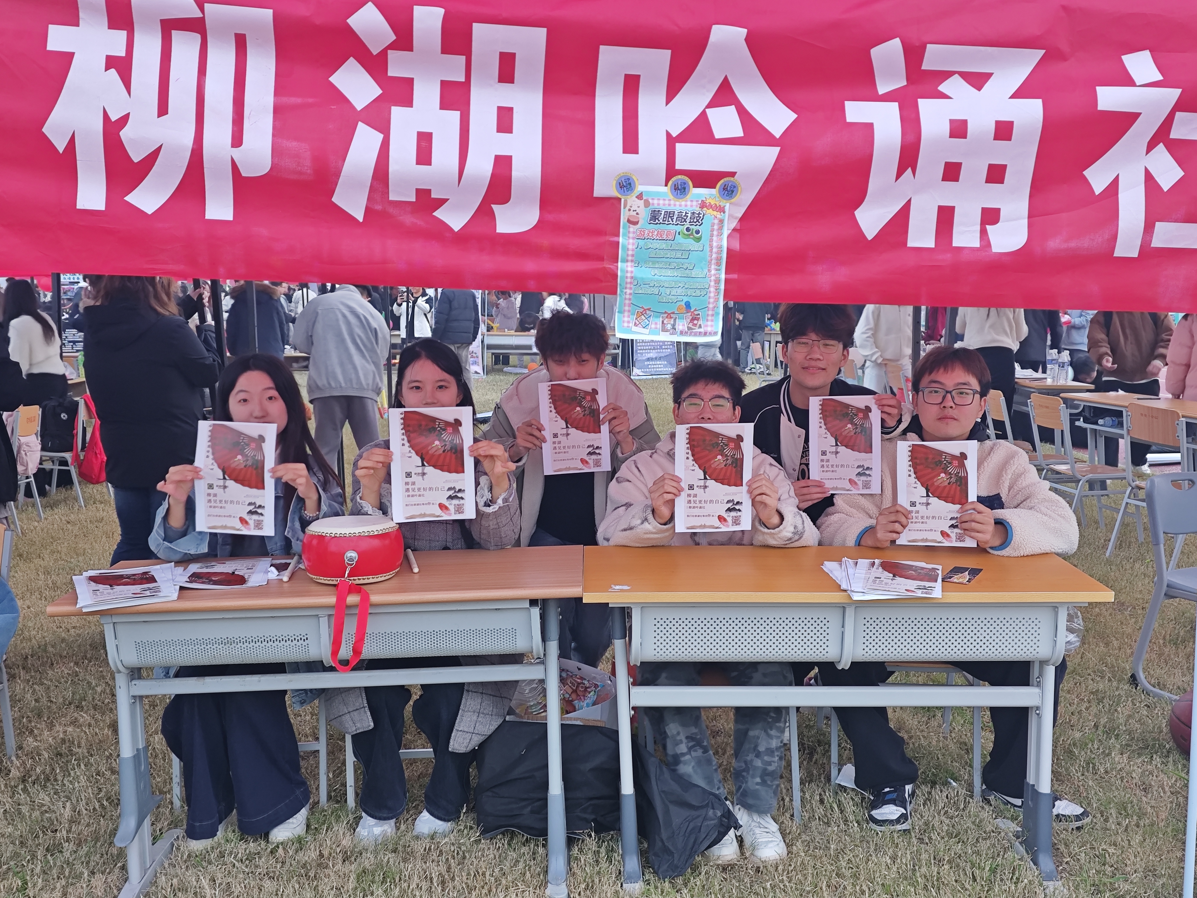 活动现场热闹非凡,各社团凭借独特定位展现专属魅力。柳湖吟诵社的“蒙眼敲鼓”妙趣横生,游戏玩法简单,趣味在线,清脆鼓点裹着笑声回荡,让传统游戏的烟火气直抵人心;鉴塘诗社创新推出“背选诗签·对雅句”,学生们在“盲选+竞答”的沉浸式体验里,品悟古典文学的雅致韵味;文苑全媒体打造“问答·盲盒抽抽乐”:将文化知识与盲盒惊喜绑定,同学们在思考中解锁知识,在期待里收获礼品,互动氛围持续升温。各社团各展所长,共同为社团文化节增添了多元色彩。