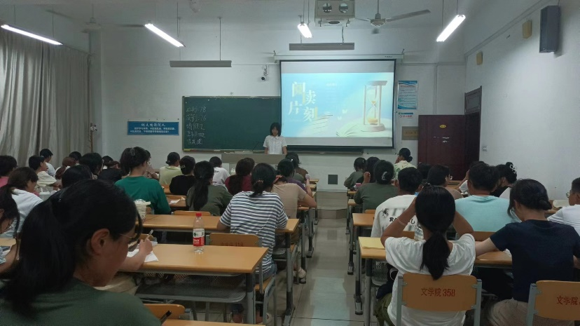 创建学习型学校,打造书香校园是时代发展的趋势和要求,为进一步贯彻书香校园建设的宗旨,深入推进促进同学们热爱读书的风气,9月11日,文学与新闻传播学院举办了以“阅读片刻”为主题的阅读素养教育活动。文学院2023级新生参加了此次比赛活动。