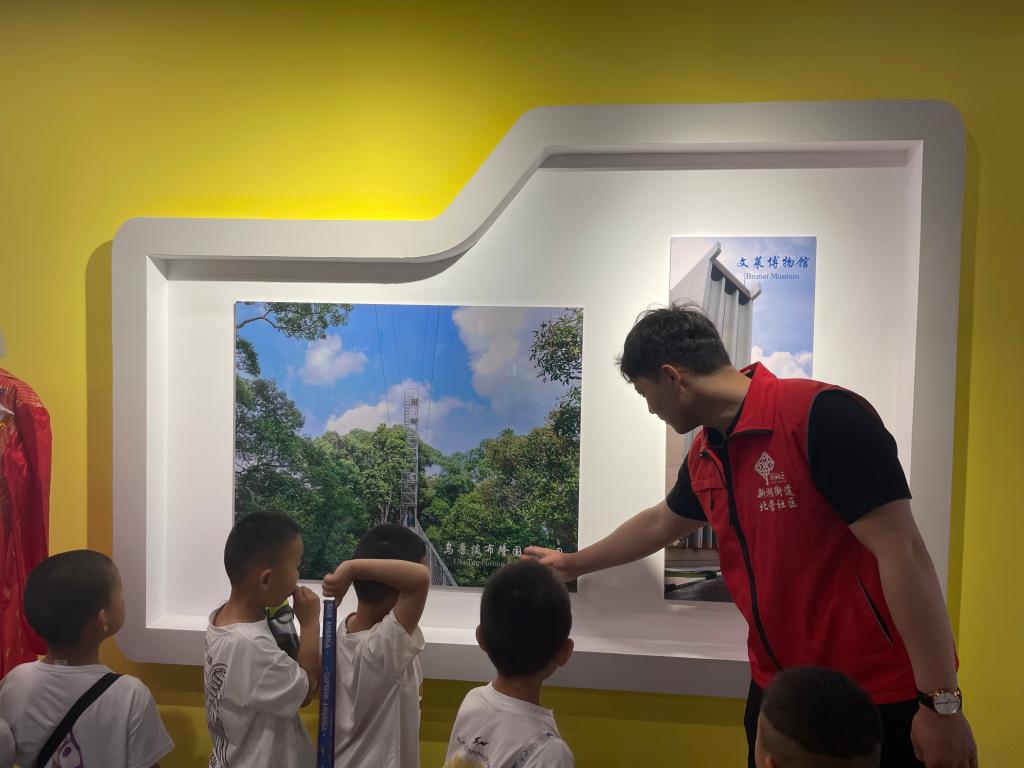 活动期间,文学与新闻传播学院的志愿者们与幼儿园园长共同带领幼儿园的孩子游览了园区已开放的展馆。几位“大朋友”与“小朋友”积极互动,结合自身知识储备以及专业特色为小朋友们讲解了东南亚各国的人文特色与自然风光。北营社区团支部书记马振为小朋友们讲解了苏禄王来华的典故,以及苏禄王后裔安树德清廉为官且不惧日本侵略者的爱国事迹。本次游览活动,为小朋友们世界观、历史观的架构起到了积极作用,拓展了小朋友们的见识。
