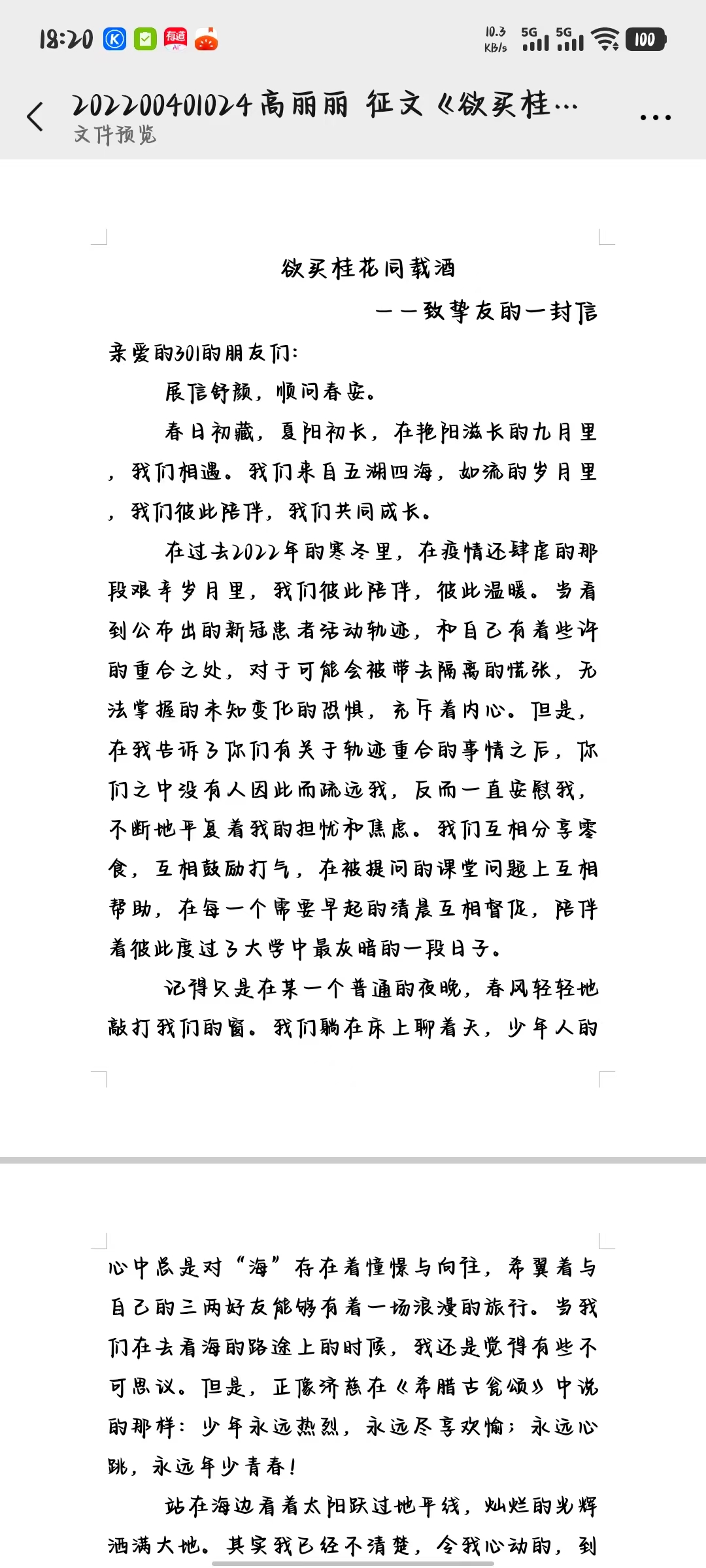 活动一经启动,便得到了同学们的热烈响应。大家纷纷拿起笔,以文传情,用书信、散文等形式,生动勾勒出宿舍生活的动人画卷。其中,参赛作品《欲买桂花同载酒》令人印象深刻,作者高丽丽回忆了困难时室友们相互陪伴的温暖时刻,以及共赴看海之约的青春记忆。众多同学也通过记录熬夜复习时的菊花茶、暴雨天的雨伞、深夜卧谈等日常细节,重新发现平凡陪伴中的深厚情谊,感悟到宿舍作为“情感容器”的意义,进而更加懂得以感恩之心珍视这份朝夕相处的缘分。