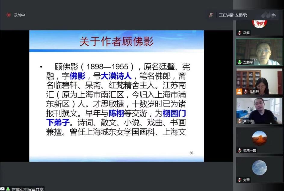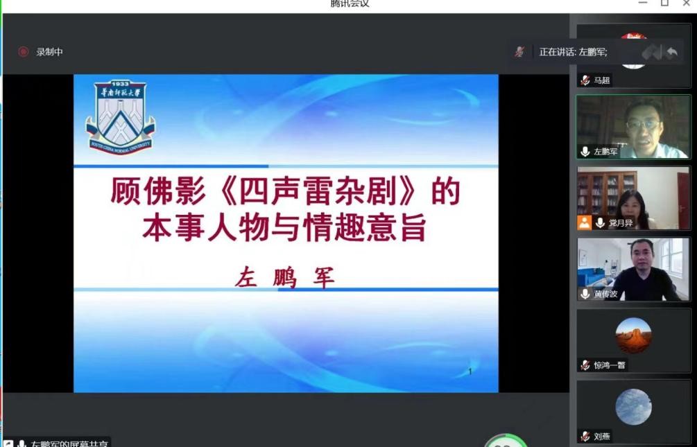 1124日晚,广东省高等学校珠江学者特聘教授,广东省宣传思想文化领军人才,华南师范大学教授、博士生导师,华南师范大学国际文化学院院长、岭南文化研究中心主任,全国汉语国际教育专业学位研究生教育指导委员会委员,中国近代文学学会副会长、中国近代文学学会小说分会会长左鹏军应邀做了主题为“顾佛影《四声雷杂剧》的本事人物和情趣意旨”的线上讲座。
